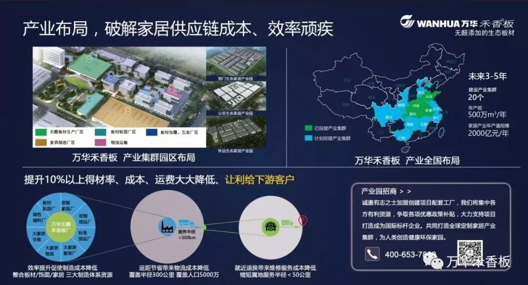 針對闆材毛利率低,運輸成本高的特性,萬華在全國範圍内聯合家具企業,建立分布式的綠色産業集群。去年5月,湖北公安縣無醛家居集群産業園開工建設。今年2月,蘭考縣産業集聚區項目地隆重舉行開工奠基儀式。
