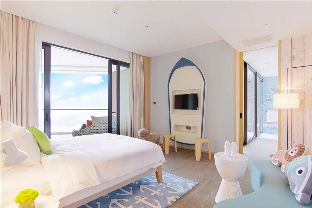 客房内橢圓狀的床頭櫃、海藍色的小沙發,搭配純真的白色圓幾,陽台上的兒童玩樂設施,每個角落都散發着天真爛漫的童真氣息。