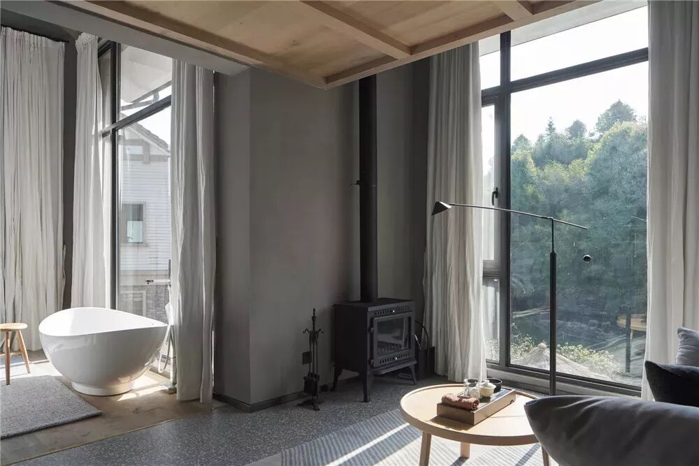 酒店共有43間客房,主要有三種房型,分别是基礎的大床、雙床房,還有頂樓的景觀套房和一樓的景觀庭院套房。客房設計沒有刻意營造中國風,不管是水泥澆築的床頭櫃、黃銅的燈具、複古的沙發椅、黑色大理的浴室牆面都極具現代工業風,客房内特别定制的家具大多出自杭州知名設計師陳飛波之手。