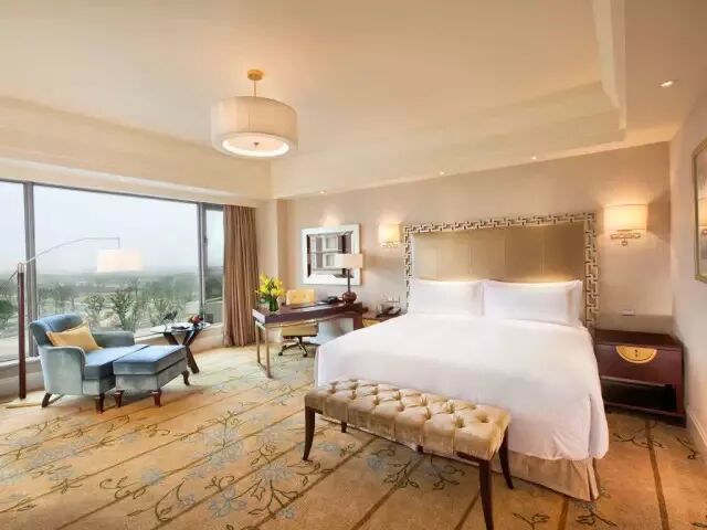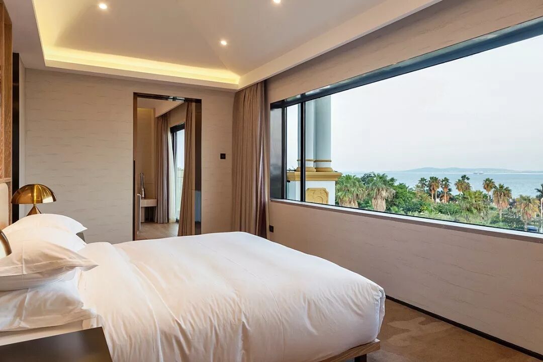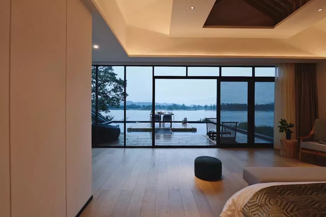 酒店客房最為出彩的部分,就在于它的視野。從面向湖景的房間裡走出來,酒店的大部分園景設計和水天一色的湖面都能盡收眼底。高一點的樓層呢,甚至不用出房門。隻要随手按下自動窗簾的開關,躺在床上就能看到。
