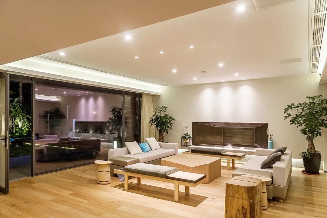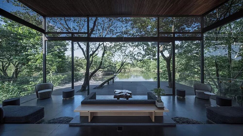 隻要是面江的一側,圍牆之類的遮擋全部被拆除,全部用落地窗或玻璃幕牆代替,最大限度地将窗外的景色引入房間,和屋内的水景一同引你入景。