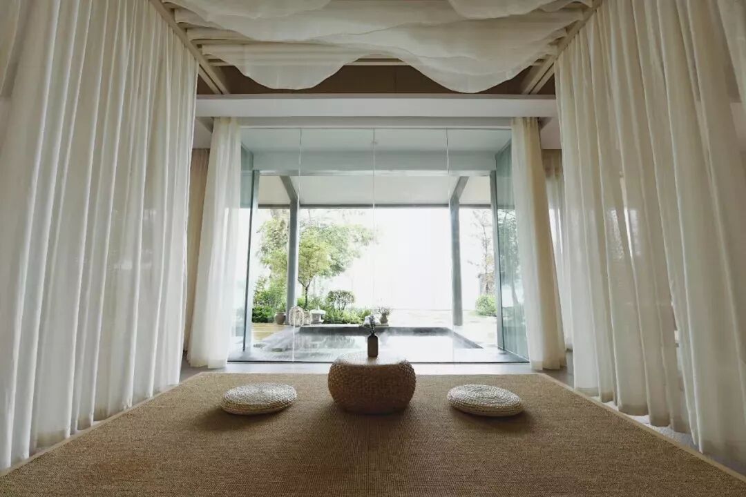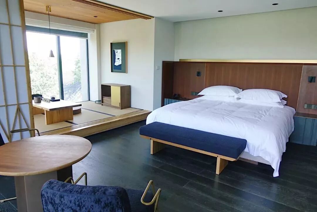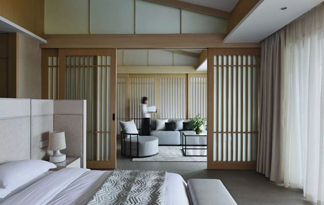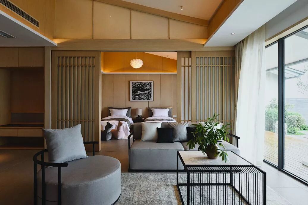 客房面積闊綽得太有誠意,極适合帶着全家來度假,而且每間客房的功能區分割也十分合理。通透的空間被打造出會客區、茶席、卧室等,庭院式的設計既保證了私密性,又将好景緻毫無保留地呈現在每一位住客的面前。