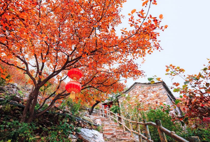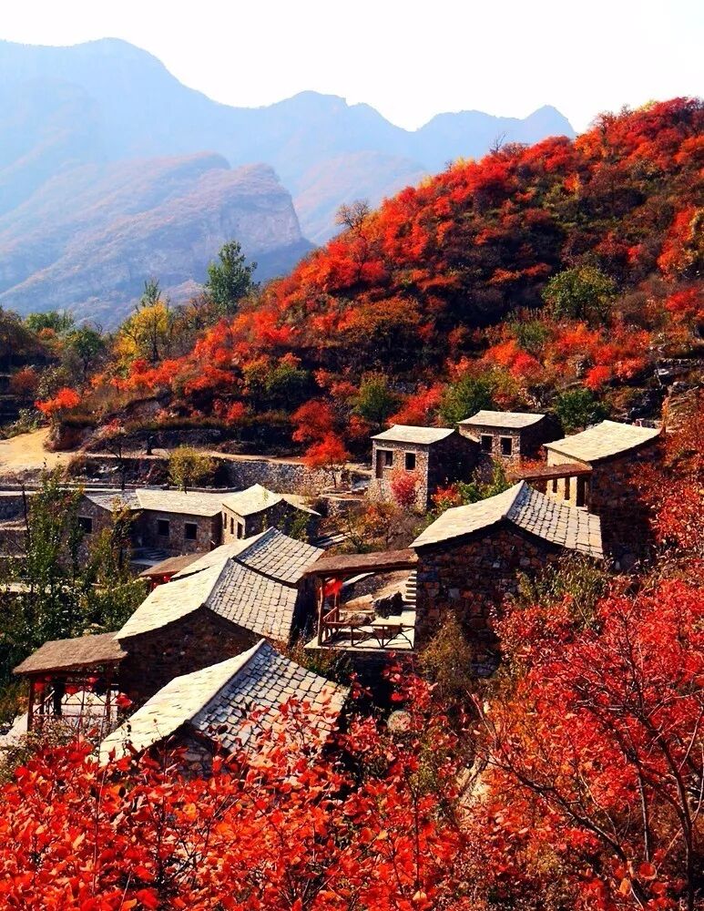 十座石屋依山而居,自帶小院或露台,秋季被漫山紅葉包圍,周圍紅葉遍野,憑欄遠眺,推開窗就能看見就能看到那一片動心的紅,仿佛置身于一幅巨大的紅色水墨畫中,壯觀到無法呼吸!