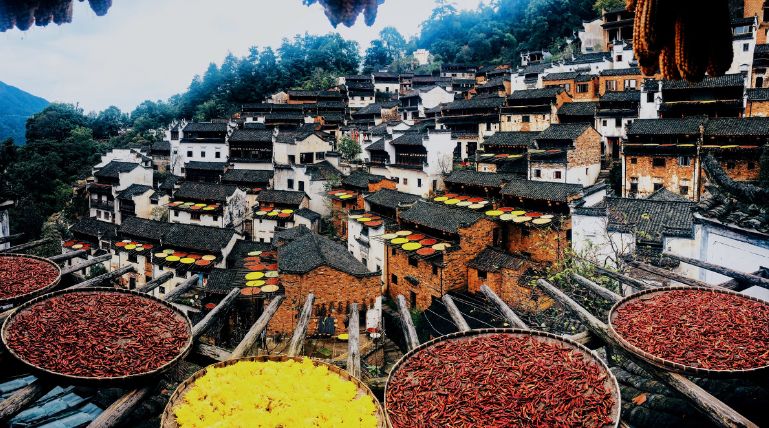 篁嶺古村最美在曬秋。每到秋季,村民們将辣椒,篁菊,蘿蔔等晾曬于土磚外牆上、曬匾裡,盡是五彩缤紛豐收的成果,好一處曬秋人家風情畫。