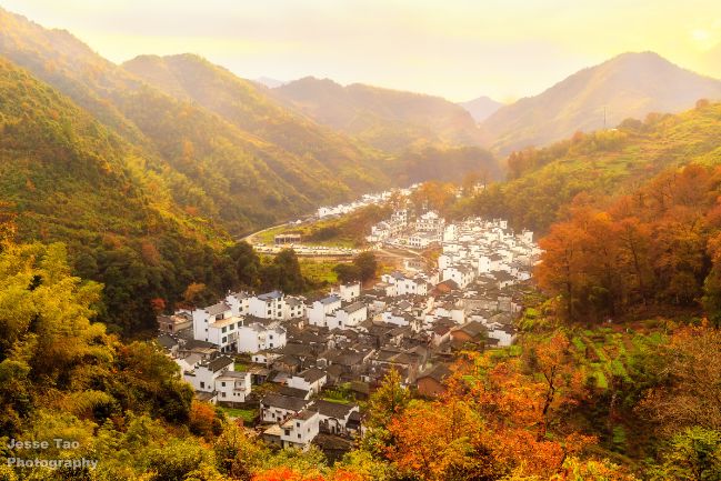 這裡的秋景,還出現在篁嶺漫山遍野金黃的稻田裡,月亮灣的竹筏倒影裡,察關村的小橋流水中.....這裡就是華東第一賞楓仙境--婺源。