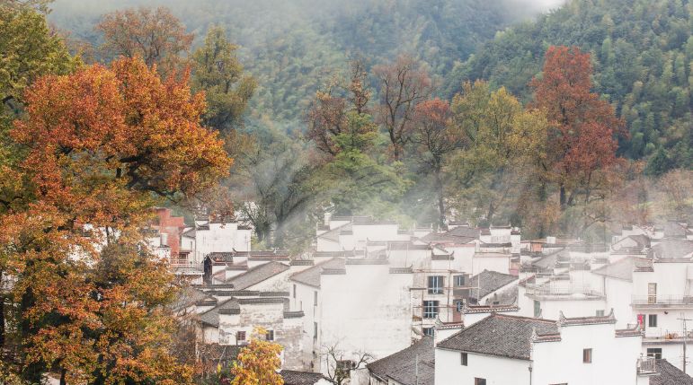 石城的秋日最朦胧。百來棵巨大的楓樹變紅時,整個石城層林盡染。尤其是晨間,薄霧遮擋着粉牆瓦黛,纏繞着紅葉,整個村莊便朦胧得猶如一幅水墨畫。