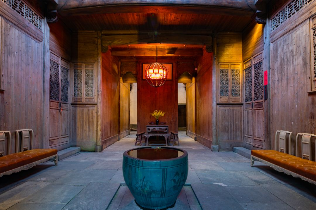 傳統徽州老宅最大的特點是有天井無院落,采光條件差往往會導緻居住體驗不佳。設計師利用家祠前的空地加建、一棟由一層咖啡廳和二層水景房構成的兩層小樓,家祠與小樓自然形成了一處有回廊的院落,空間頓時變得有了層次感。