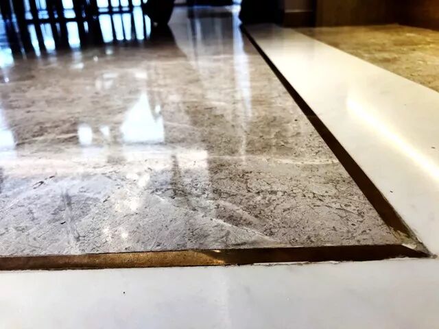 ④地面大理石平鋪:灰麻色和白色石材搭配,中間以金色銅條勾邊。據設計師介紹,如果采取鍍金色不鏽鋼條勾邊,成本會降低,但時間久了表面鍍色會被磨掉,露出不鏽鋼本色。而采取銅條就不會出現這個問題。▼