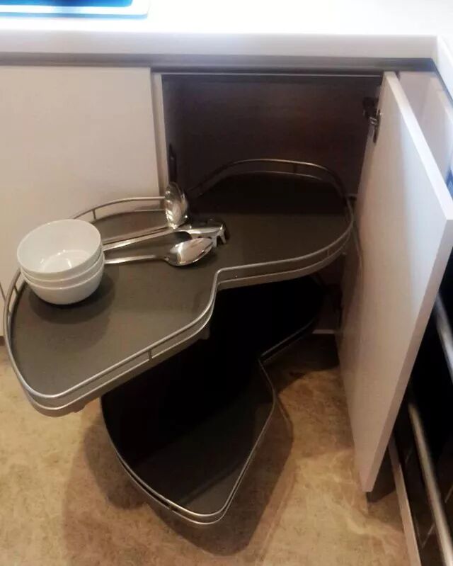 ⑧轉角拉籃和下拉拉籃:充分利用轉角櫥櫃底下的空間,大件鍋具都可以放置其中。吊櫃上有下拉拉籃,方便個矮的家庭主婦拿取物品。▼