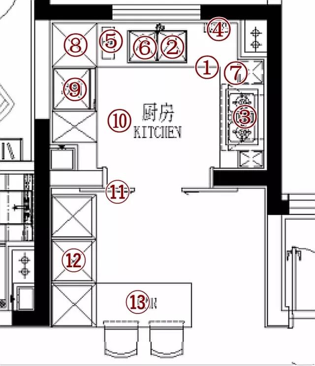 ⑬西廚吧台:在靠近過道的位置設置吧台,業主可以在此做蛋糕、包餃子、擀面條、吃早餐,非常方便。