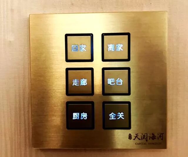 室内消滅了傳統燈具開關,而是把所有智能化燈光控制,集成到一個面闆上,按鈕式控制,玄關、客餐廳、卧室均是如此。不同生活場景所需不同照度的燈光可單獨控制,更加人性化。