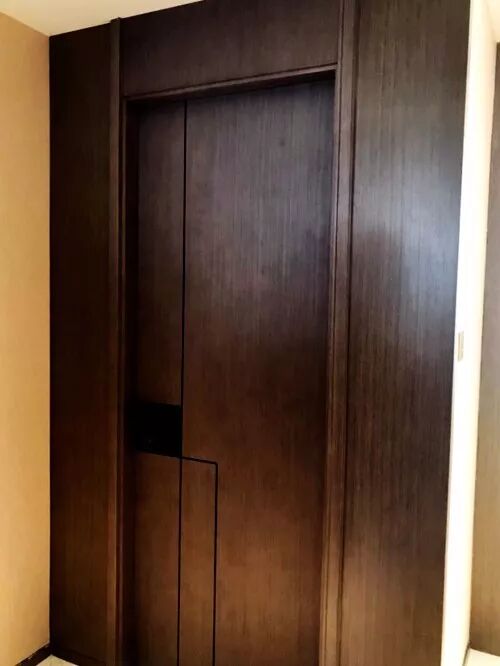 着重強調一下,除了玄關櫃,這款戶型其他的木作櫃體也全都是采取的法國索菲亞品牌或同級别,櫃門都以嵌入式一體化拉手取代了突出的把手,既美觀整潔又保證安全。而且,全部木作都是實木貼皮,木料的紋理、質地能充分展現。