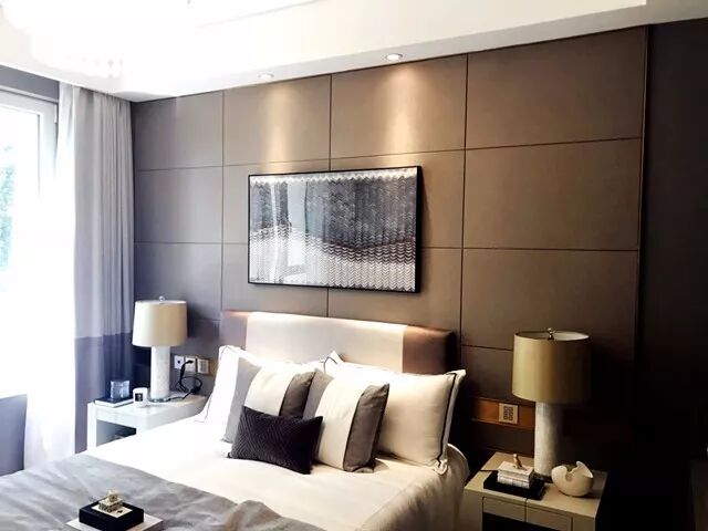 ④背景牆:采取皮質壁布硬包的方式,深棕色調沉穩大氣。▼