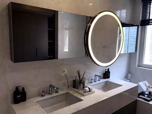 ②鏡櫃+魔鏡:台盆上方的超長鏡櫃,一直延伸到浴缸上方,實現超強的收納功能。兩個台盆正中上方的位置,是一塊魔鏡,相當于一個大規格浏覽器。早晨起床刷牙的時候,就可以看天氣預報和新聞,洗澡的時候可以播放電影、音樂。