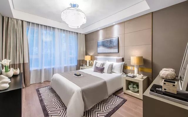 主卧開間能達到4.5米,這可是很多戶型客廳的尺度。即便是很多别墅戶型,也都達不到這個标準。你在很多超大戶型中看到的特大款雙人床、腳榻、五鬥櫥、休閑沙發等等,通通都能擺進去。