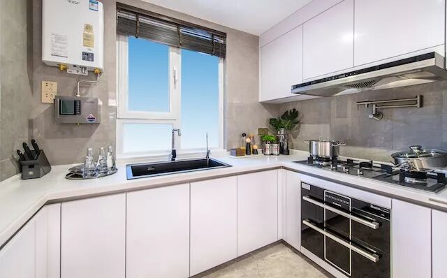 ③抽油煙機、竈具、消毒櫃:德國進口博世或同檔品牌,煤氣竈為三眼爐具,可同時煲湯、炒菜、燒開水。而且裝配了熄火斷氣裝置,特殊情況下可以自動斷氣。