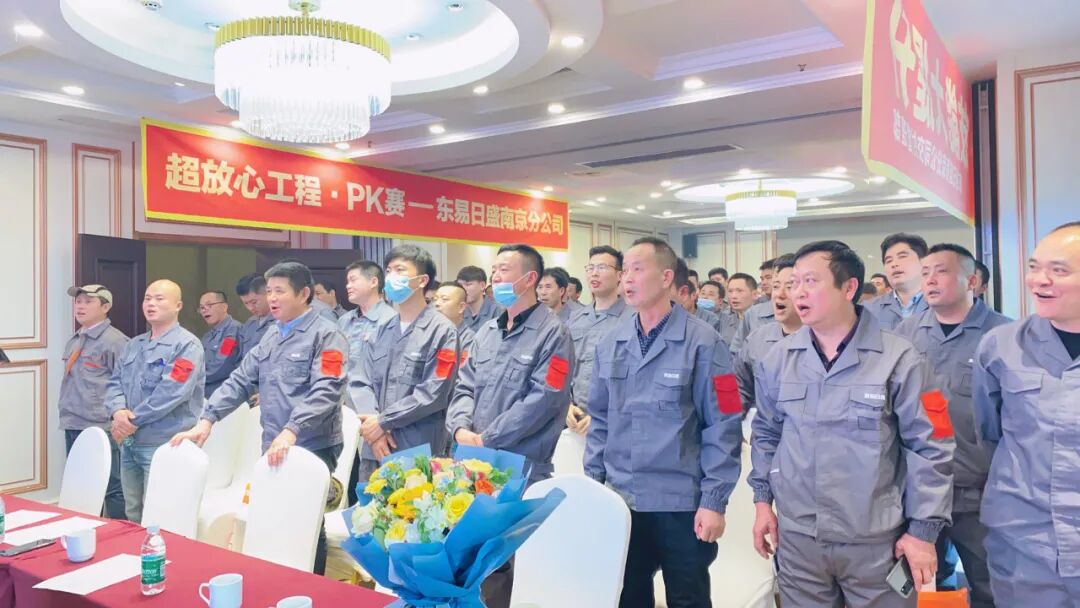 超放心工程PK賽之始,全場響起昂揚的旋律《東易之歌》。高亢嘹亮的歌聲唱出每一位工人師傅的豪情壯志!是東易人對業主安心、放心、舒心的保證,全體交付管理部人員承諾為客戶打造最優質的匠心工地。